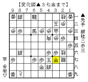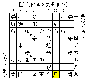 △3三歩以下▲4四飛△4三歩▲3三桂成△同角▲4九飛△6五歩▲3四歩△4四角▲3五銀△3八銀で、ソフトの評価値-1367で後手優勢。