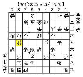 ▲9八玉△9五歩▲同歩△6六歩▲同銀△8五桂▲8八銀で、ソフトの評価値+95で互角。