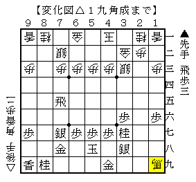 よって後手は変化手順として、▲7五角には△7六飛と潜り込んで▲7七銀に△7五飛から△1九角成として、飛車と角香の交換の展開です。