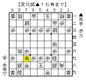▲7七角に△8二飛なら▲4五桂△4四銀▲同角△同歩▲5三桂成で、ソフトの評価値+649で先手有利。