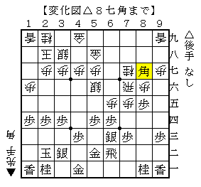 この手順は△7八角成から馬を作って△9九馬と先に香得になって後手が大成功のように見えます。