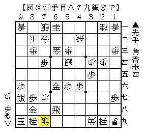 実戦は、△7四同角以下▲6六桂△6七と▲7四桂△7八とで、ソフトの評価値-3274で後手勝勢。