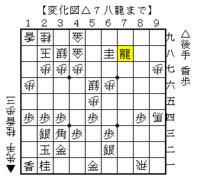 △7八龍に▲4六桂なら△4四香▲5四桂△5八歩▲6二桂成△同金で、ソフトの評価値+468で先手有利。
