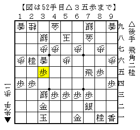 △3五歩以下▲7六歩△6五飛▲6六歩△同飛▲3五香△4二金で、ソフトの評価値-3544で後手勝勢。