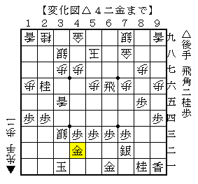 この手順は△4二金に▲2三歩の垂れ歩が攻めの継続手ですが、やや攻めが細いので後手勝勢です。