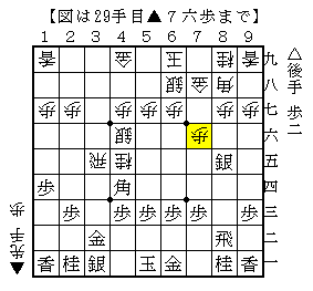 上図は、先後逆で相居飛車の力戦形からの進展で▲7六歩と突いた局面。ソフトの評価値-199で互角。