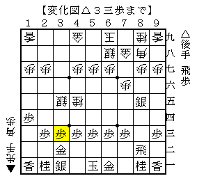 先手が早い段階から袖飛車の▲3八飛として、以下3筋を交換するあまり見かけないような局面になりました。