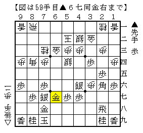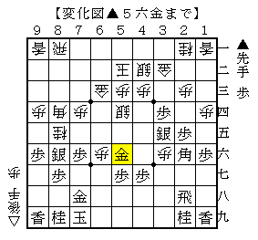 この手順だと後手は手の流れが調子がいいように思えたのですが、最後の▲5六金で耐える形です。