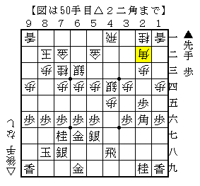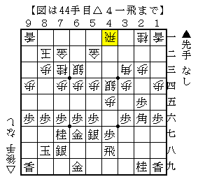 実戦は△4一飛以下▲4六歩△同歩▲同銀△4五歩▲5七銀△2二角で、ソフトの評価値+137で互角。