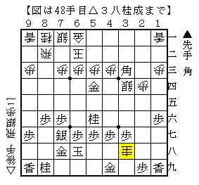 ▲1一角成△2六桂▲5五香△3八桂成▲同金で、ソフトの評価値+46で互角。