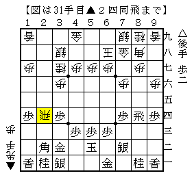 実戦は△2四同飛以下△7五歩▲2二飛成△同銀▲5五角打△3三桂▲9一角成△7三桂で、ソフトの評価値+238で互角。