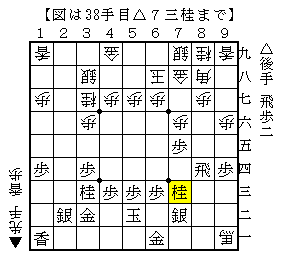 ▲5五角の両取りに△3三桂と跳ねて▲9一角成に△7三桂と跳ねて受けます。