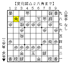 後手は横歩と取らせてしかも歩切れになるので条件は悪いのですが、2筋と3筋の傷を消してから▲3五飛に△2八角と打ちます。