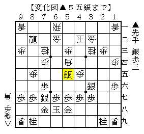 ▲5五銀に△4三角なら▲6三銀△5一角▲4四銀△3四角▲3五銀直△2五角▲2六歩で、ソフトの評価値+3957で先手勝勢。