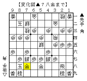 ▲7八金に△6五桂なら▲6六銀△同銀▲同歩△5七桂成▲同金△3九角▲5八飛△6九銀▲6七角△4四飛▲5三銀△5八銀成▲同銀△5九飛▲8六桂で、ソフトの評価値+981で先手優勢。