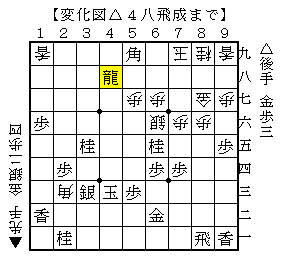 1枚捨てて駒を取るというのが少し分かりにくいのですが、△4八飛成とした形が先手玉に受けがありません。