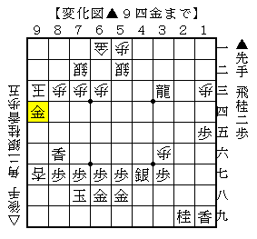 ▲9一飛では▲9四金がありました。ソフトの評価値+99976で先手勝勢。