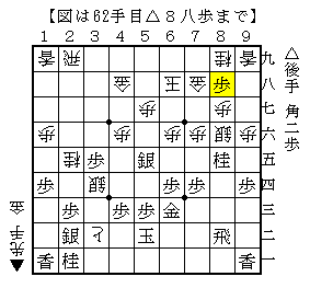 ▲3七歩以下△4七飛▲5八龍△6六歩▲3六歩△2六金▲3五歩△1七飛成▲2七歩△同金▲6三角△1八銀▲7四角成で、ソフトの評価値+1141で先手優勢。