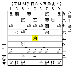 上図は、先後逆で横歩取り青野流からの進展で△5五角とでた局面。ソフトの評価値-78で互角。
