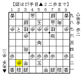 この手順は▲2二歩に△3三桂と逃げて▲2一歩成に△4二銀とする手で、部分的にはこの手順は横歩取りによくでてきます。