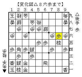 △8六歩に▲4六歩なら、△8七歩成▲4五歩△7七と▲4四歩△6七と▲4三歩成△同金▲5九飛△4七歩▲同金△5八と▲4四歩△同金▲5三銀△6八飛成で、ソフトの評価値-1504で後手優勢。