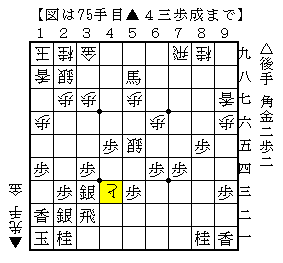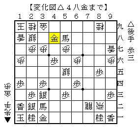 △4八金以下▲3二龍△同金▲同飛成△3一金▲同龍△同銀▲4一金△4九馬▲1七角△3九馬▲同角△4九飛▲3八金△4七歩成で、ソフトの評価値-1344で後手優勢。