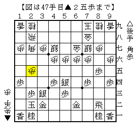 上図は、先後逆で筋違い角からの進展で▲2五歩と突いた局面。ソフトの評価値-396で後手有利。