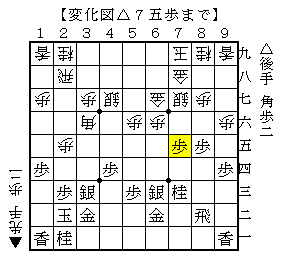 変化手順でこれで互角のようですが、後手としては相手の角道に気をつけながら7筋の位を安定させるために△7四銀と上がって△7六歩の突き出しを狙う感じです。