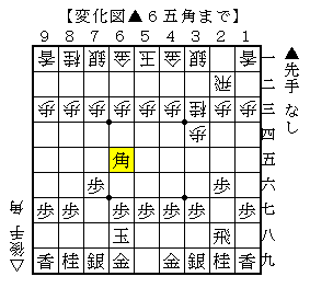 ここから先手はじっくりした駒組みにするか、もしくは▲6五角と打って力戦型にするかの選択があります。