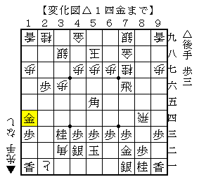 △2三同金▲3二角△1四金で、ソフトの評価値+173で互角。