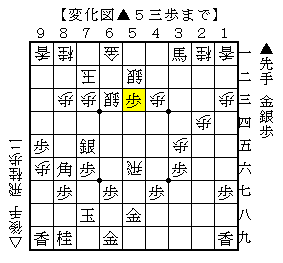 ▲5三歩に△同銀なら▲6五銀△5五飛▲6四銀直△同銀左▲同銀△同銀▲6三銀△8二玉▲6四馬で、ソフトの評価値+2127で先手勝勢。