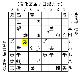 ▲7五銀で▲7五歩なら△8四飛▲7四桂△7二玉▲8二銀△8五銀▲9一銀不成△8六銀▲同歩△7三銀▲6七金引で、ソフトの評価値+203で互角。