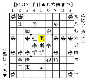 実戦は△5五角▲同銀△5六角で、ソフトの評価値-506で後手有利。