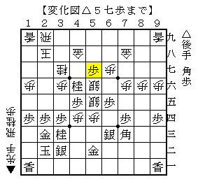 △5七歩に▲同金なら△5五角▲同銀△3八角で、ソフトの評価値-2702で後手勝勢。