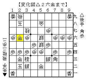 △2六金以下▲2七歩△3七金▲同玉△2五桂▲4七玉△3七角で、ソフトの評価値-1930で後手優勢。