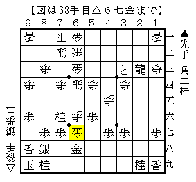 先手は2枚の角と龍の利きをうまく活用して少しずつ相手の駒を取っていく形で、▲9一桂成とすれば先手も上部も広くなり先手勝勢のようです。