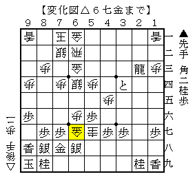 △6七金からの変化手順として、▲6七同金△同歩成▲6四桂△7八銀▲4四角△8二玉▲7二桂成△同金▲7六銀で、ソフトの評価値+783で先手有利。