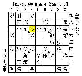 対局中は△4七歩成とされるのはうるさいと思って▲4六同銀としましたが、この手はあまりいい手ではなかったようです。