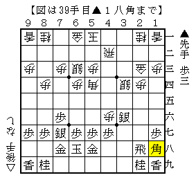 実戦は▲5八金△5四角▲1八角で、ソフトの評価値-40で互角。