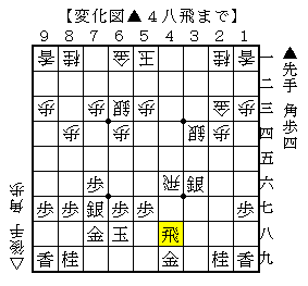 ▲4八飛に△3六飛なら▲2七角△5四角▲3六角△同角▲3一飛△6二玉▲4二飛成△5二銀打▲2一飛成△4一歩▲3一龍上で、ソフトの評価値+399で先手有利。
