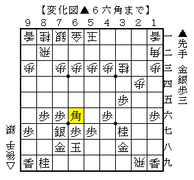 ▲6八金引以下△2三飛▲5五歩△4三銀▲4八角△3三桂▲5七角△2五歩▲2四角△同飛▲5一角で、ソフトの評価値+482で先手有利。