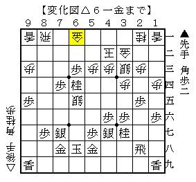 後手は△5八桂成と反対側の金を取って以下△6六銀~△3九角と厳しく攻めて調子がよさそうですが、先手も▲1七角~▲2八角打とやや異筋のような受け方でいい勝負のようです。