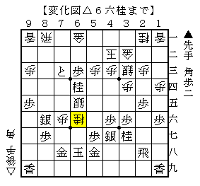 △6六桂に▲7九歩なら△5八桂成▲同玉△6六銀▲6九桂△3九角▲3八飛△2八金▲3九飛△同金▲1七角△2九飛▲6二歩成△1九飛成▲2八角打△1八龍▲6一とで、ソフトの評価値-182で互角。