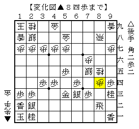 この手順は▲3九金の早逃げに△5七歩成~△5九角が狙いの手ですが、先手も▲5八金が粘りのある手で以下飛車と角の交換になり、最後は△3一銀打と自陣に手を入れることになります。
