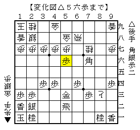 △5六歩に▲3九金なら△5七歩成▲同金△5九角▲5八金△6八角成▲同金△3一銀打で、ソフトの評価値-282で互角。
