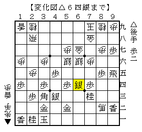 ▲7九玉△6五歩▲8二馬△6六歩▲同銀△6四銀で、ソフトの評価値-328で後手有利。