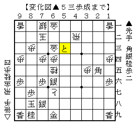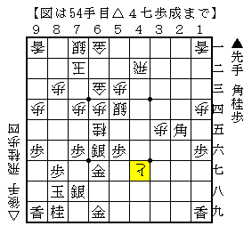 この手順は▲5五歩からの攻め合いでこれは自然な手ですが、△5七と▲5四歩△6七とに▲5三歩成が意表の手です。