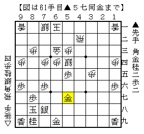 この手順は▲6一角成として角と金の交換をする手で、後手玉を薄くしないと勝負にならないと思っていました。