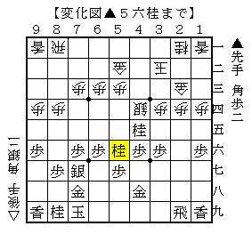 ▲5六歩に△5二金なら▲9六歩△4二玉▲3七桂△3一角▲2四歩△同金▲同角△同歩▲1五銀△2七角▲2六飛△3八角成▲2二歩で、ソフトの評価値+166で互角。
