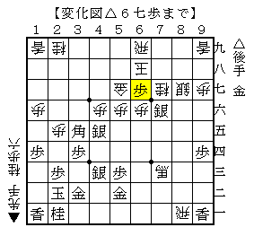 ▲6八角△7四飛▲7七歩△7三桂▲5六歩で、ソフトの評価値+60で互角。